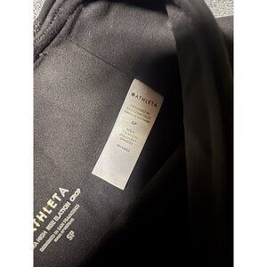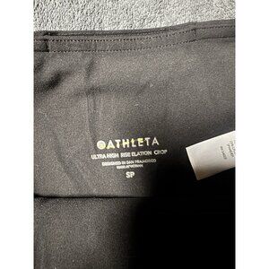 The product is a pair of Athleta Elation Ultra High-Rise Leggings designed for women in a petite size small. These black leggings feature an ankle length and a high-rise waist for a comfortable and secure fit during activewear activities. The compression area is focused on the legs to provide support and a flattering silhouette. Perfect for workouts or casual wear, these leggings combine style and functionality for the modern active woman.