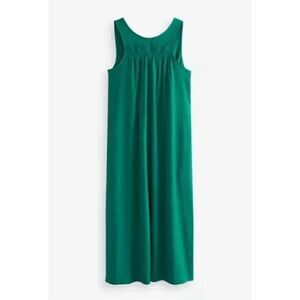 This Athleta midi dress in a gorgeous emerald green hue is a must-have for any fashion-forward woman. The dress features a sleeveless tank-style top with a flattering V-neckline and ruched waist detailing. The dress falls to a midi length and has a comfortable, lightweight feel, making it perfect for travel, parties, and casual or business occasions.