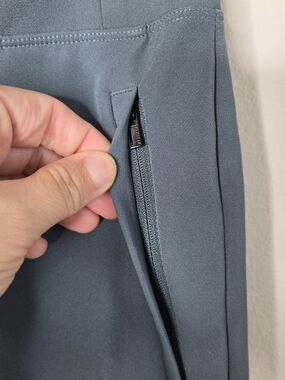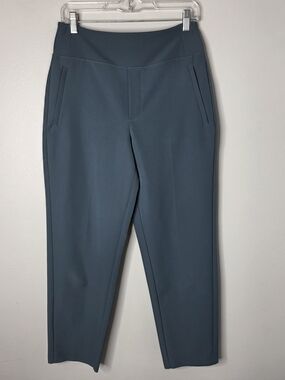 Versatile high-waist pants in a slate blue tone. Smooth, structured fabric for a polished silhouette. Straight leg cut for comfortable all-day wear. Discreet front pockets add functionality. Easy to dress up or down for work or weekend.