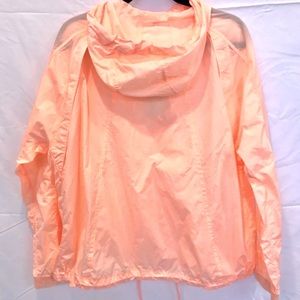 Peach lightweight jacket with drawstring hood, zip pockets outside, pockets inside, drawstring at waist.