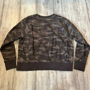 A comfy Athleta Farallon sweatshirt in green/brown camo print (Athleta calls it "Black Olive Camo"). Size Large. Lightweight, breathable organic cotton with an easy fit through the body. Crew neck, stretchy ribbing at neck, cuffs, and hem.