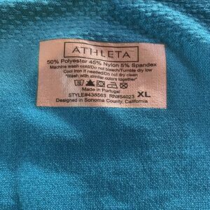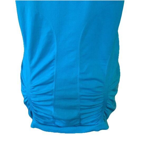 Perfect for the gym, yoga, running or just errands around town. Athleisure. In a beautiful teal blue color. The true color is the cover photo. My photos were hard to capture the true teal color. In good, preowned condition. My mannequin is a size 6 so this top will fit snugly. Made with breathable and unstinkable technology. Soft, stretchy fabric wicks and breathes. Non chafing seamless design. Gripper dots stop hem from riding up. Shirring doubles as body camouflage as well.