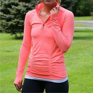 Athleta Fastest Track Half Zip Womens Pullover Size Medium Pink Long Sleeve Top. This Athleta pullover is designed for women and comes in a medium size with a regular fit. It features a high neck and long sleeves with thumbholes, offering both style and functionality. The pink pullover is made from a soft, breathable fabric, making it ideal for activewear. It includes ruching detail and is machine washable for easy care. The item is pre-owned.