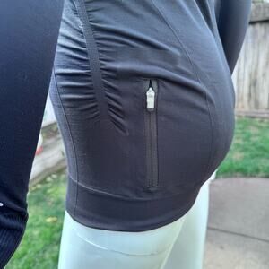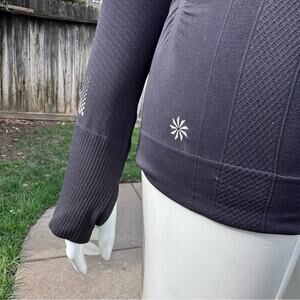 Athleta Finish Fast Ruched Reflective Pullover Thumb Holes Pocket Black Sz XS. In good preowned condition. Measurements are approximate taken flat.