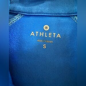This blue long sleeve running quarter zip from Athleta offers a stretchy fitted design ideal for active pursuits. Crafted from moisture-wicking fabric, it ensures comfort and flexibility during workouts. The sleek silhouette and technical material make it a perfect choice for any athletic activity.