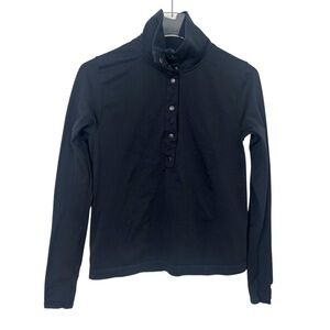 This stylish black snap closure shirt from Athleta features a classic polo collar and long sleeves, making it a versatile addition to any wardrobe.