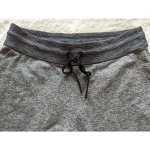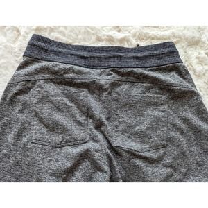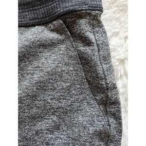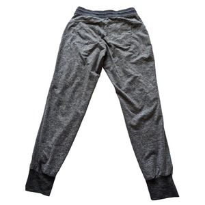 Heathered gray joggers with dark gray accent in waistband and cuff. Lightweight, stretchy and comfortable. Drawstring waist. Front and back pockets.