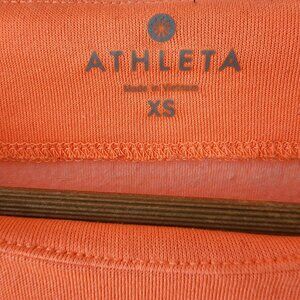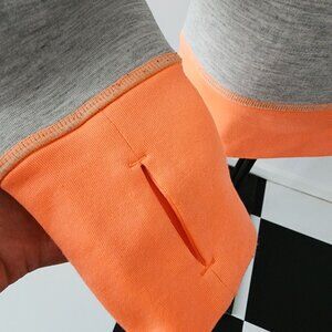 Athleta brand Fuse Sweatshirt in Light Grey Heather and a bold Cosmic Orange. Scuba fabric wears well and offers a sleek and polished look to a pullover sweatshirt. Great for the gym, running errands, or casual wear. Nice feature of longer sleeves with added thumb holes to keep your hands cozy. In good condition with a minor, small blemish on left side armpit area (see photo 4). Although barely noticeable with the grey heathered pattern. Smoke free and pet free home.