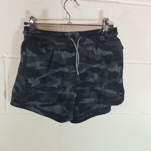 Athleta Gir All Play 3" black camo running shorts girls size xl 14 style 531686-06 waist across 13 rise 9 inseam 3 bin 2