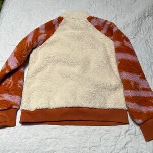 Athleta Girl So Snug Sherpa fleece quarter zip pullover sweatshirt. Cream, orange and pink patterned raglan sleeves. Very good condition, light wear. Size 7.