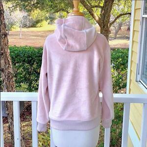 Super soft and fuzzy, velour-like sweatshirt. Side zip pockets, cute hoodie. Color is a pale (ballet) pink.