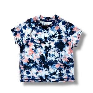 Stylish swim rashguard for kids. Features a vibrant blue and pink tie-dye pattern. Comfortable and protective for water activities. Quick drying and UV protective. Excellent pre-owned condition.