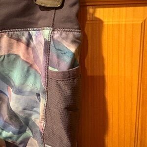 These shorts are characterized by A colorful printed pattern, likely featuring a leaf or abstract design, with contrasting mesh panels on the sides. Semi-fitted with a mid-rise waist. Made with Featherweight Stretch fabric, which incorporates recycled polyester and is designed to be lightweight and facilitate sweat evaporation. Includes a comfortable knit waistband and an inner lining, often described as an "inner underwear layer". Suitable for various activities including school, practice, and play. Girls size XL/14. Good condition. Please see measurements