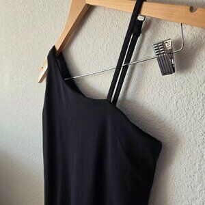 Lightweight and versatile, this asymmetrical tank dress features a sleek black design with a comfortable fit and breathable fabric.