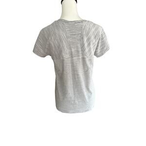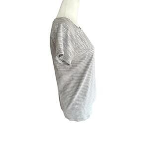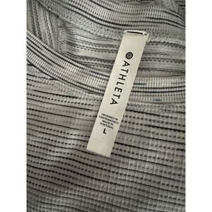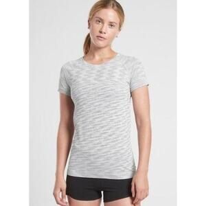 Gently Used in excellent condition Athleta Women's Top. Short Sleeve in size Large. 79% Nylon, 21% Polyester. Stretchy with Grips along bottom to keep your top in place.