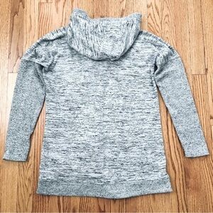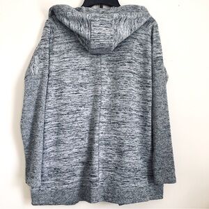 * Light gray marled hooded open front cardigan. Pockets. Ribbed trim and hem. Style 721640