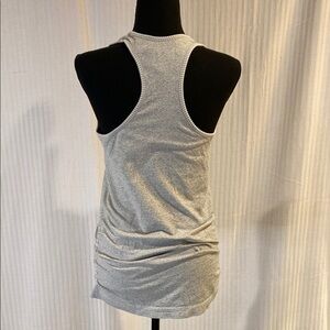 This gray tank top from Athleta features a fitted design with stylish ruching on each side, offers a flattering silhouette. The sleeveless style and soft, stretchy fabric make it perfect for both casual wear and active pursuits. The rubber stays at the hem keep the top from exposing the midriff during yoga and other workouts. I love this Athleta top feature!