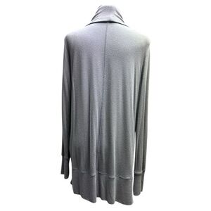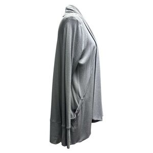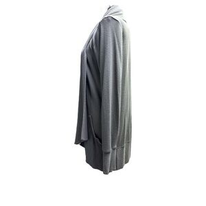 This Athleta cardigan sweater in a solid gray hue features a chic open-front design with flowing, cascading panels. Crafted from soft knit fabric, it offers a relaxed silhouette perfect for layering. Its mid-hip length adds versatility to any outfit.