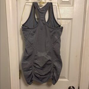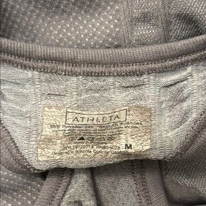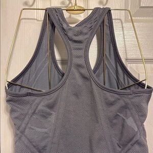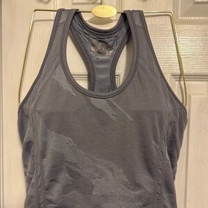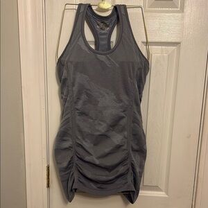 This gray tank top from Athleta features a sleek, fitted design with stylish ruching along the sides for a flattering fit. The sleeveless style and scoop neckline offer comfort and ease of movement, making it perfect for both workouts and casual outings.