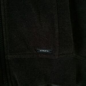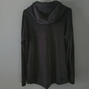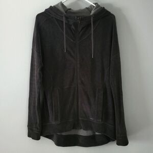 Athleta velour full zip hoodie with hi-low effect and front pockets in Charcoal Gray.