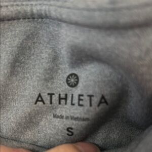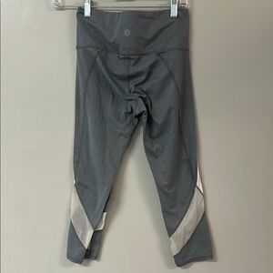 These Athleta leggings feature a sleek gray design with striking white diagonal stripes on each leg, offering a modern and dynamic look. Crafted from a stretchy performance fabric, they provide a comfortable and supportive fit, ideal for any active pursuit. The cropped length and wide waistband ensure both style and functionality.