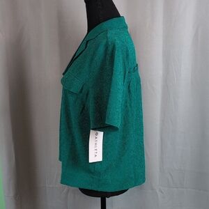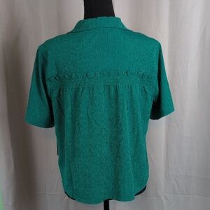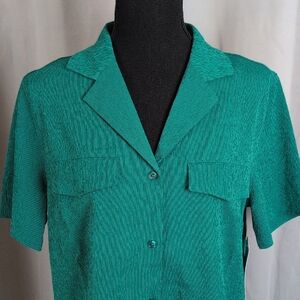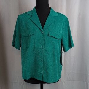 Stylish green button-down with a classic collar. Short sleeves and front pockets add functionality.