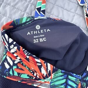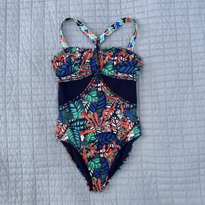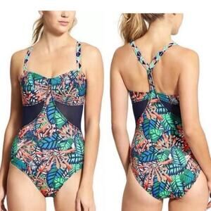 Athleta Hanalei One Piece Swimsuit Multi Color Tropical Mesh Panels Size 32 B/C