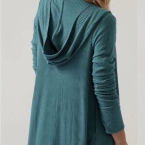 Beautiful teal color for fall, lightweight hoodie, wrap with peep hole for thumb. Only worn twice. In very good condition.