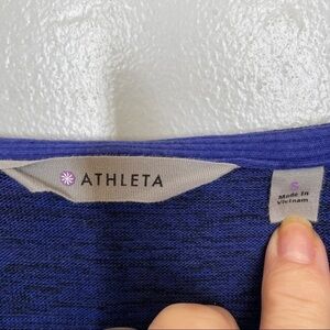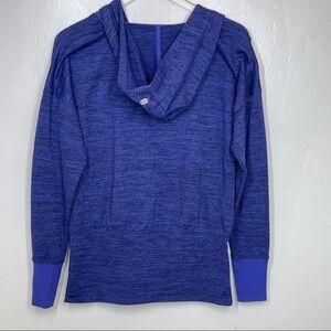 Comfy Athleta blue/black heathered pullover with hood. Cuffs have thumb holes. Pullover has drop waist and kangaroo pocket. Logo on the hood. Excellent pre-owned condition. Size S.
