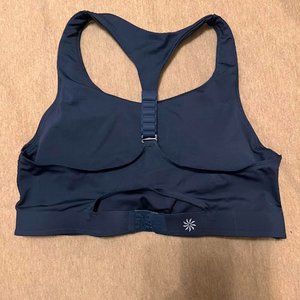 High impact sports bra in a navy color. It also has removable cup pads and is true to size! It has only been worn a handful of times and has not rips, tears, stains, or peeling.