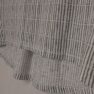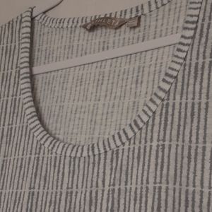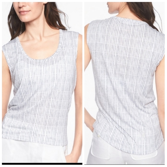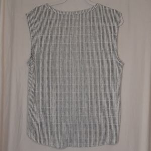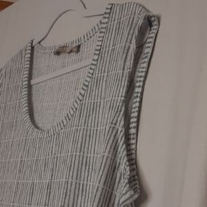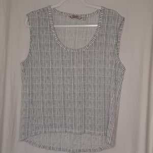 Really soft material in a bluish/gray striped pattern. Sleeveless with a high low hem, scoopneck, flowy fit. No visible imperfections noted. Stock photo is for reference only!