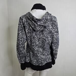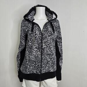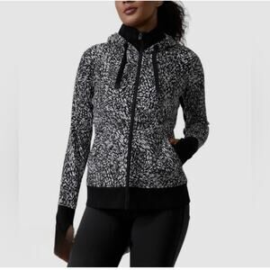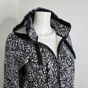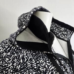 Athleta Triumph, Windstorm geometric printed pattern, fitted with stretch hooded, full zip jacket, pockets and thumbholes