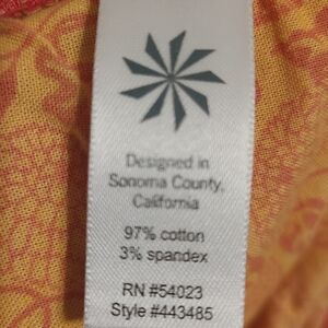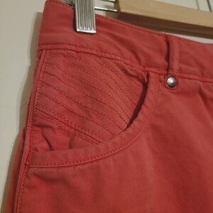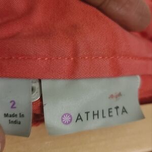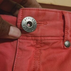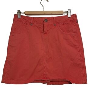 Women's adorable denim mini skirt in watermelon color (red/pink) by Athleta, size 2. Zipper and button closure with draw cords at waist. Front and back pockets with a small split in the back. Fabric blend of cotton and spandex. Excellent pre-owned condition overall; some wash wear. Please see close-up pictures for more details.