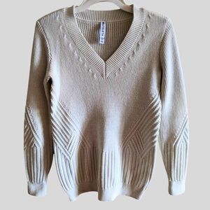 Stay effortlessly chic and cozy in this Athleta chunky knit pullover sweater, women’s size XXS. Designed in a soft Dove White (off-white) shade, this sweater features a deep V-neckline, long sleeves, and ribbed + geometric knit detailing for subtle texture. Made from a breathable cotton/poly blend, it’s warm yet lightweight—perfect for layering all year.