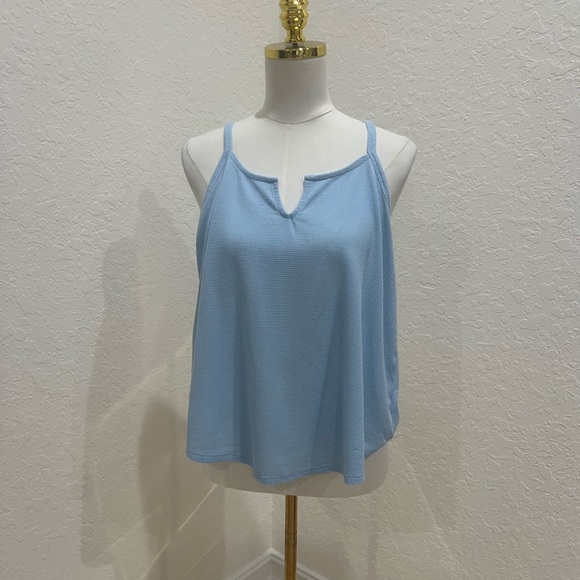 This is an Athleta Wind Down Sleep Cami in a light blue color.