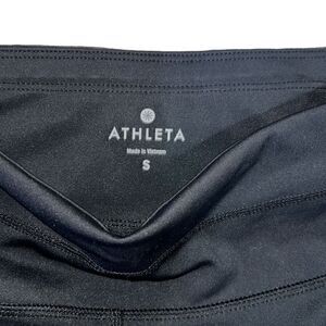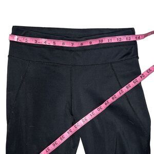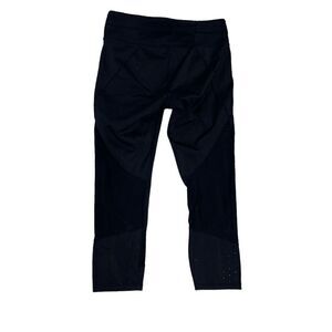 Good, preloved condition. Athleta Laser Cut Sonar Cropped Leggings Black Mesh Panels sz S Small Athleisure. Athletic. Fold over pocket on back waistband.