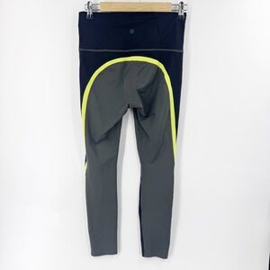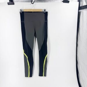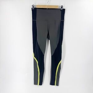 Stylish gray and black leggings featuring neon yellow accents. Perfect for workouts or casual wear.