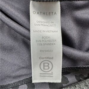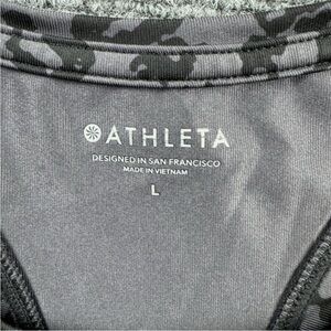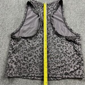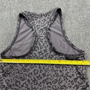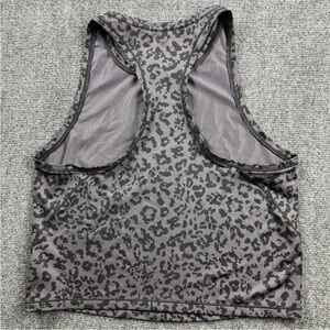 Lightweight racerback tank from Athleta. Charcoal gray base with darker gray leopard print trim. Moisture-wicking performance fabric. Ideal for workouts or everyday wear.