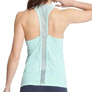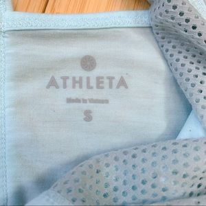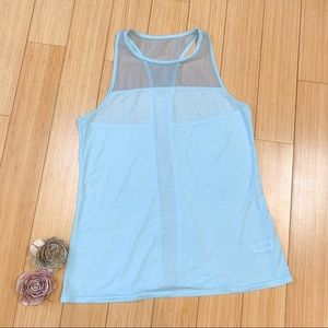 Athleta light blue Airy Essence exercise fitness workout tank top, size small. Looser fit. Pre loved good condition. Has net mesh at the high chest and shoulders. Unstretched bust measures 17 inches across, length 25 inches.