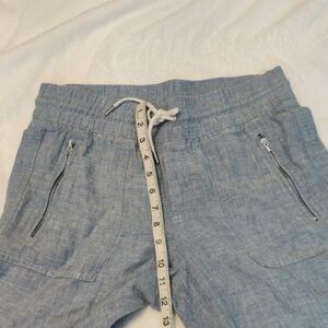 Comfortable light blue jogger pants. Features elastic waistband and zippered pockets. Perfect for casual wear.
