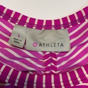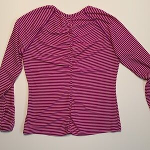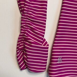 Athleta long sleeve workout top. Full stretch nylon/spandex fabric. Magenta and white stripes. Gathering at cuffs and down center back. Womens size Large. Great used condition.