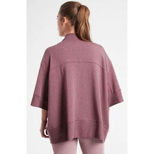 Lotus Wrap Open Cardigan from Athleta. Textured jersey fabric in Dark Vintage Plum Nep. Relaxed fit. Side pockets. Size S/M. See photos for measurements. Gently preowned condition with no tears or stains.
