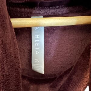 Keywords: Athleta velour pullover, maroon turtleneck sweatshirt, cozy lounge top, boxy fit sweater, soft Athleta sweatshirt, plush casual wear, size XL