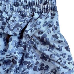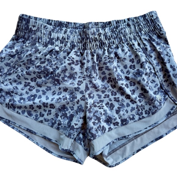 Athleta Mesh Racer Run short with 4” inseam. Gray/Silver and Dark Gray Leopard Print.