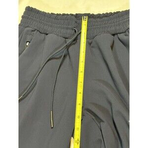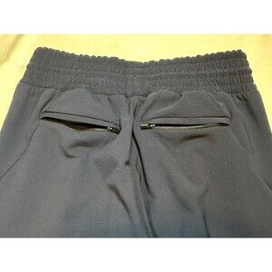 Nice condition pants. Navy blue color. Ankle zip and zipper pockets in back and one in front. Total of 5 pockets. Elastic waist with drawstring. Good stretch. Rise is 9.5 inches. Inseam is 27 inches. Waist is 13 inches measured. Overall length is 37 inches. Leg opening is 7 inches. Very soft.