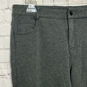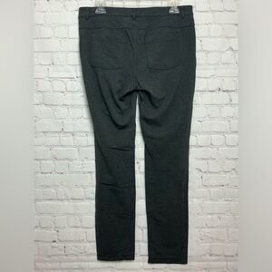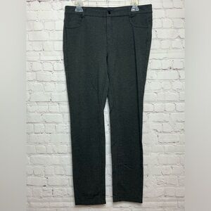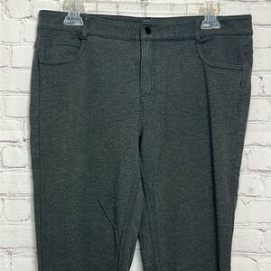 Athleta flat front heathered grey pants. Button and zipper closure with yoga-like stretch and feel. Back patch pockets.