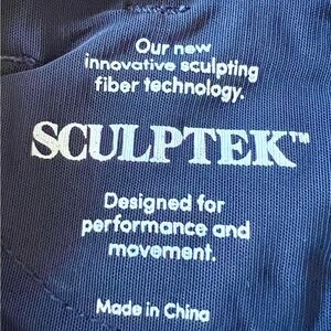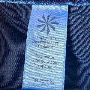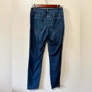 Athleta branded 'Skulptek' tapered slim fit style denim jeans in a darker medium wash color, mid-rise, front and back pockets, zipper and button closure.