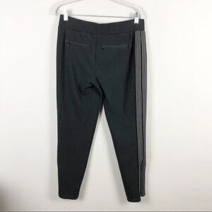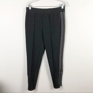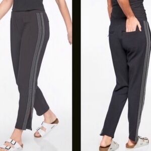 Mid rise track pants, ankle zips, pull on style, straight leg, semi-fitted, back pockets. Black. Commuter. Athleisure, Athletic, travel, lounge, work, neutral, sporty.