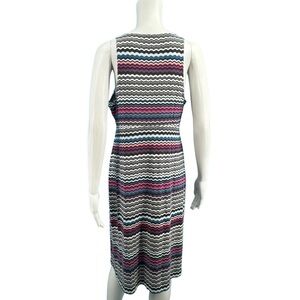 Easy to wear comfortable pull over sleeveless dress with multi color chevron print.