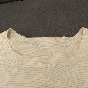 Gently worn, excellent condition. Really nice butter yellow color with silver stripes. Great for holidays under sweater of as a top.